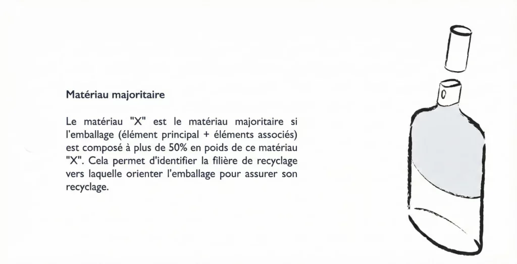 En France, comme en Europe, le matériau principal est celui qui compose l’emballage à plus de 50% en poids de ce matériau. Cela permet de définir la « famille » de l’emballage afin de déterminer s’il dispose d’une filière de recyclage.